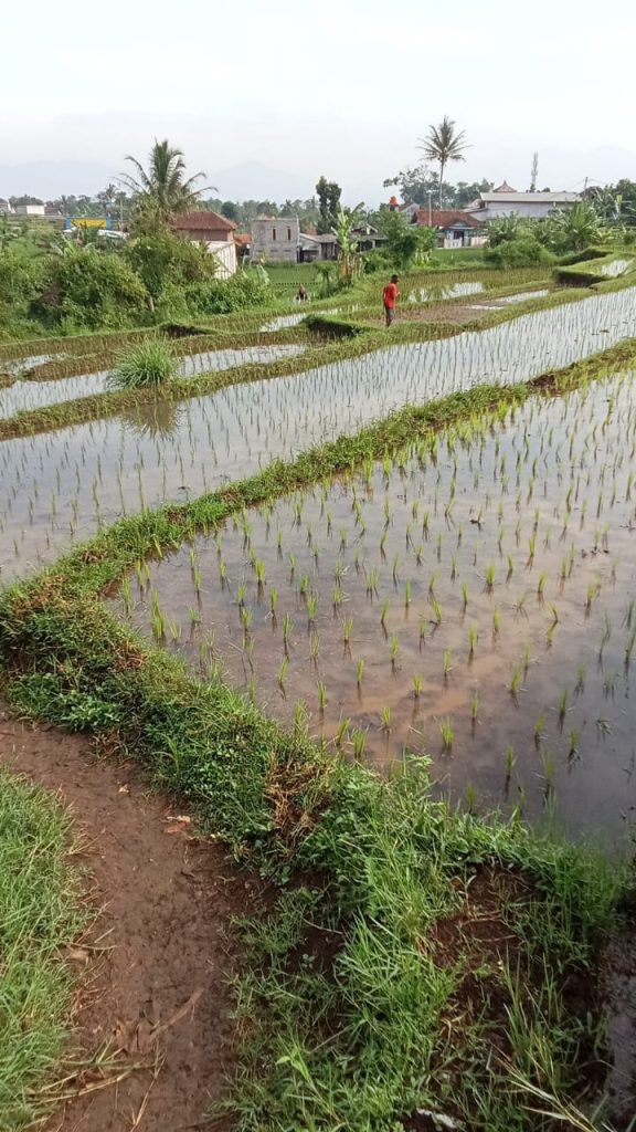 - Tanaman padi muda tampak tumbuh cukup merata pada petakan.